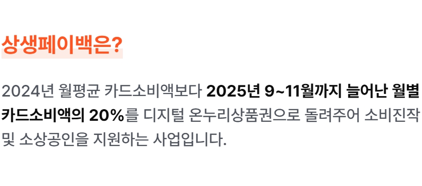 상생페이백은 정부의 소비 활성화 정책으로, 2025년 9~11월 카드 소비액이 2024년 월평균 소비보다 증가한 만큼의 20%를 디지털 온누리상품권으로 환급해 주는 제도입니다. 월 최대 10만 원, 최대 3개월(총 30만 원)까지 받을 수 있어요.
